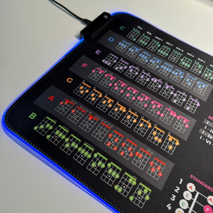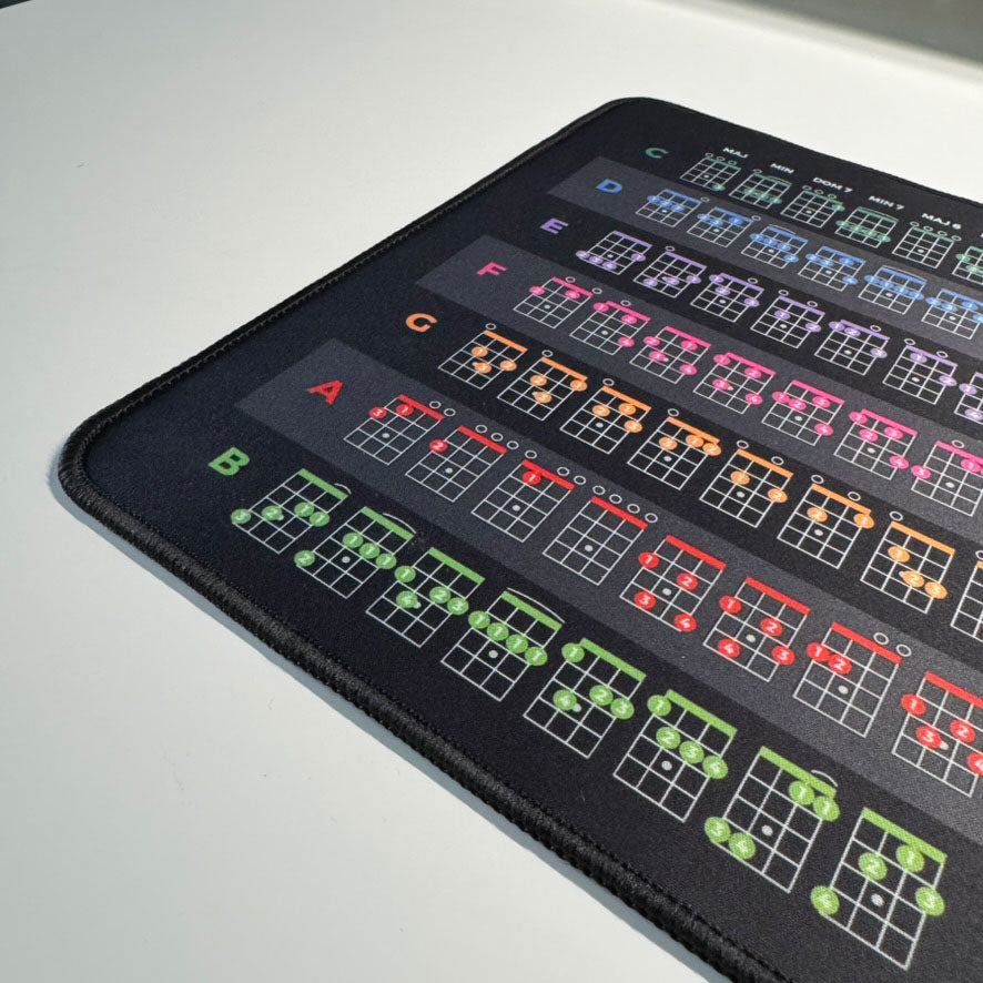 I’ve been teaching myself ukulele for a few months, and this mousepad helped everything finally make sense. The fretboard chart and chord diagrams are so clear — it’s like having a mini teacher on my desk.