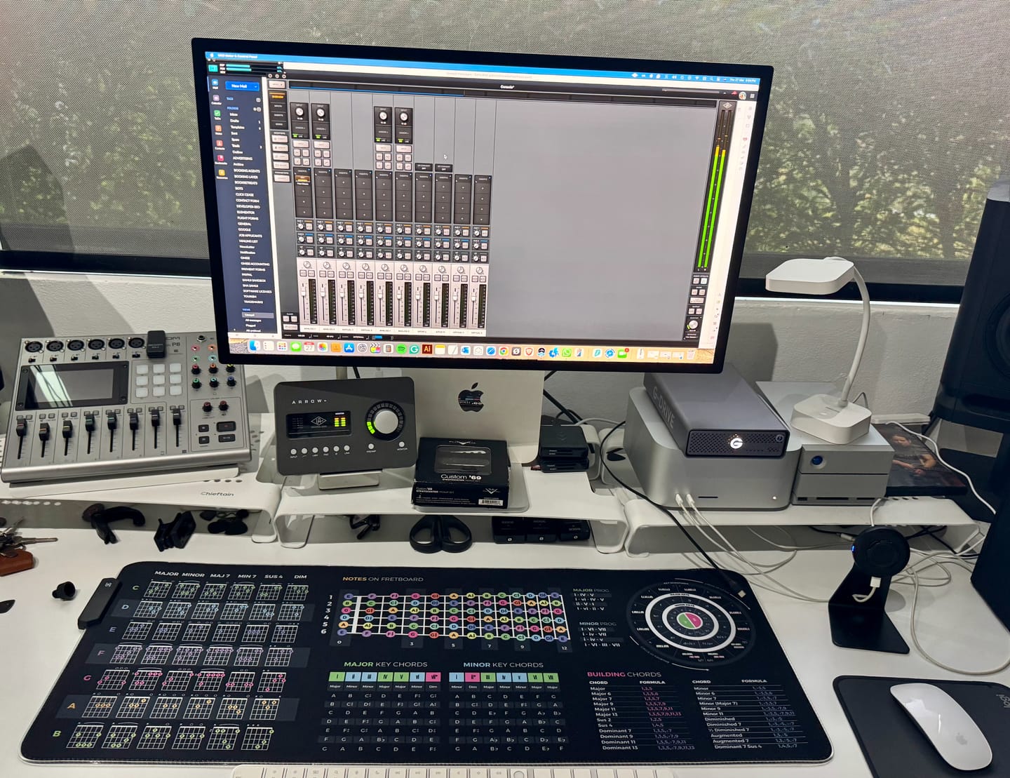 42 chords. Full fretboard. Circle of fifths. Chords in every key. All right under your hand while you play or produce.